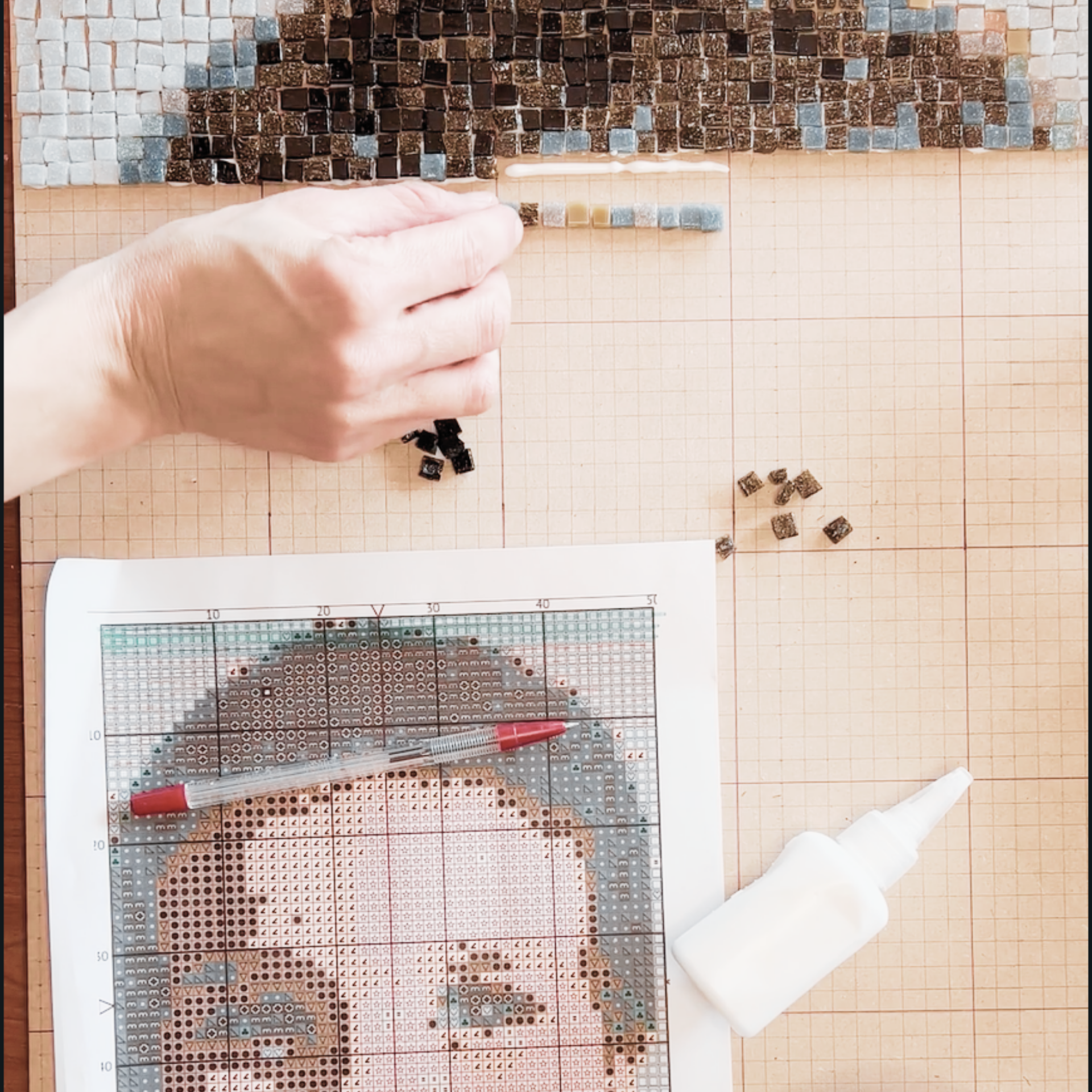 Transformo una fotografía en una obra única hecha con miles de piezas de vidrio cortadas, encastradas y adheridas una a una, sobre una base de madera.